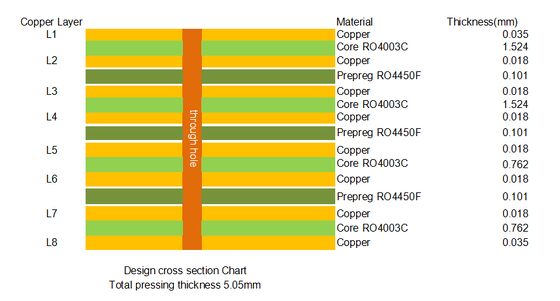 Deze printplaat is voorzien van een 8-laags koperconfiguratie, die speciaal is ontworpen voor elektronische toepassingen met hoge frequentie en hoge betrouwbaarheid. De materiaalsamenstelling bestaat voornamelijk uit RO4003C kernen, RO4450F prepreg en hoogwaardige koperfolie, waarbij de RO4003C kernen dienen als de belangrijkste diëlektrische lagen om uitstekende signaalintegriteit te garanderen, en de RO4450F prepreg fungeert als het verbindingsmedium tussen de lagen, in samenwerking met de koperfolie om een stabiele en hoogwaardige meerlaagse structuur te vormen.
